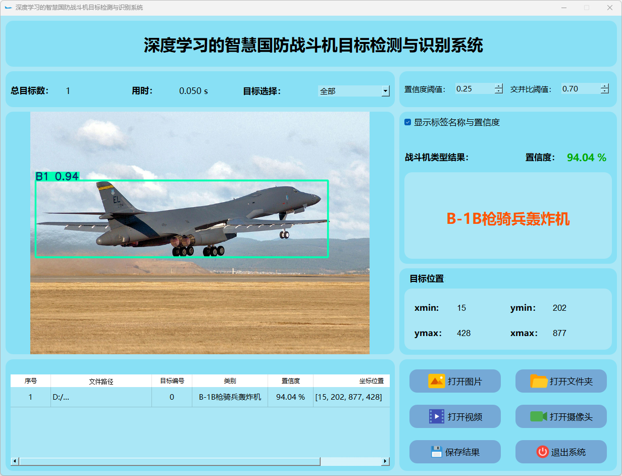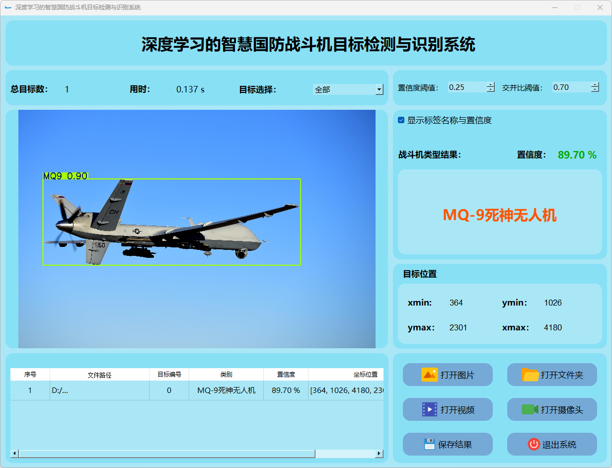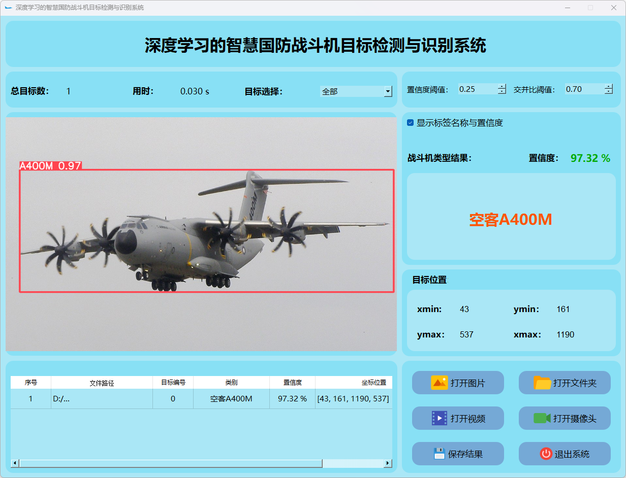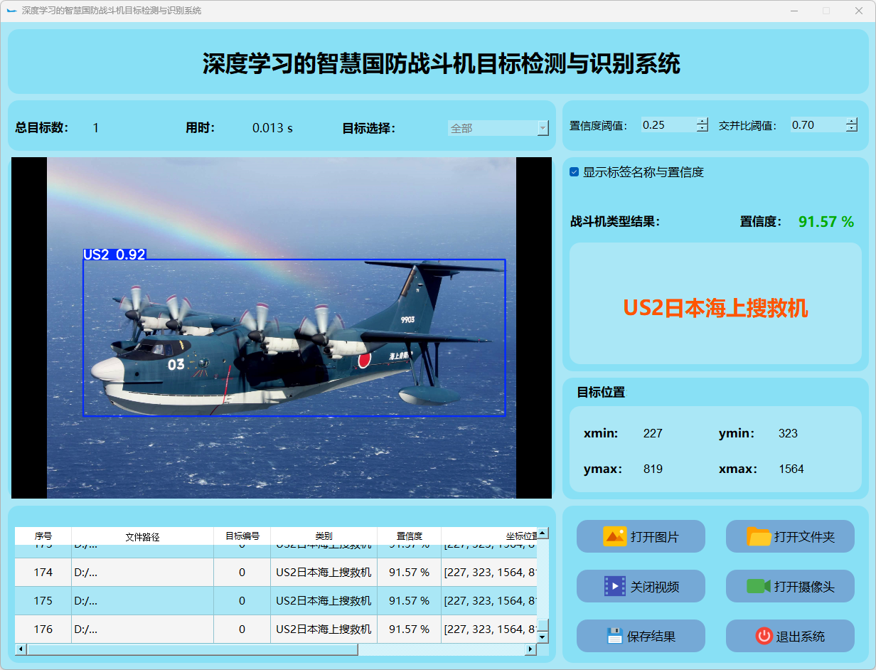 本研究还整合了基于PyQt5构建的用户界面系统。搭建了一个功能完善且易于操作的交互平台。该平台能够接受图像或视频流输入,并实时地显示检测结果。此外,在战斗机类型识别方面表现突出,并根据检测结果采取相应的应对措施。通过一系列实验和测试验证,在稳定性与效率方面均表现优异