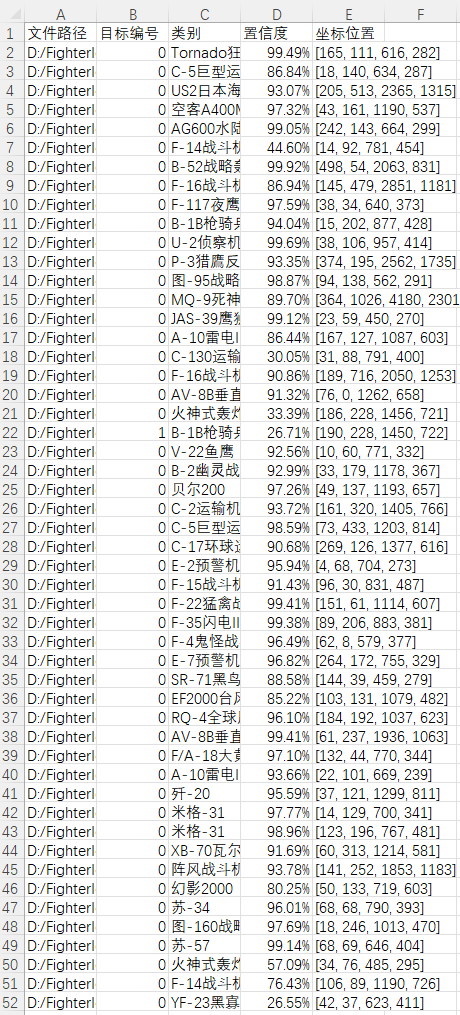 这张图呈现了战斗机目标的一次详细检测记录,并涵盖了具体的测试时间、识别的目标类型以及各项行为的置信度水平和目标位置坐标等关键信息。通过图形化界面用户能够直观观察并评估这些检测数据,并据此优化作战指挥系统效能。