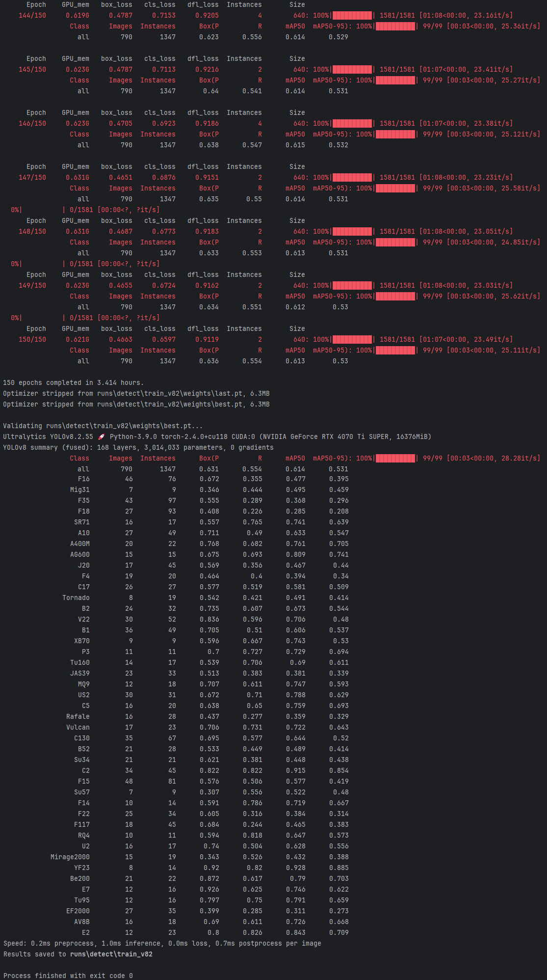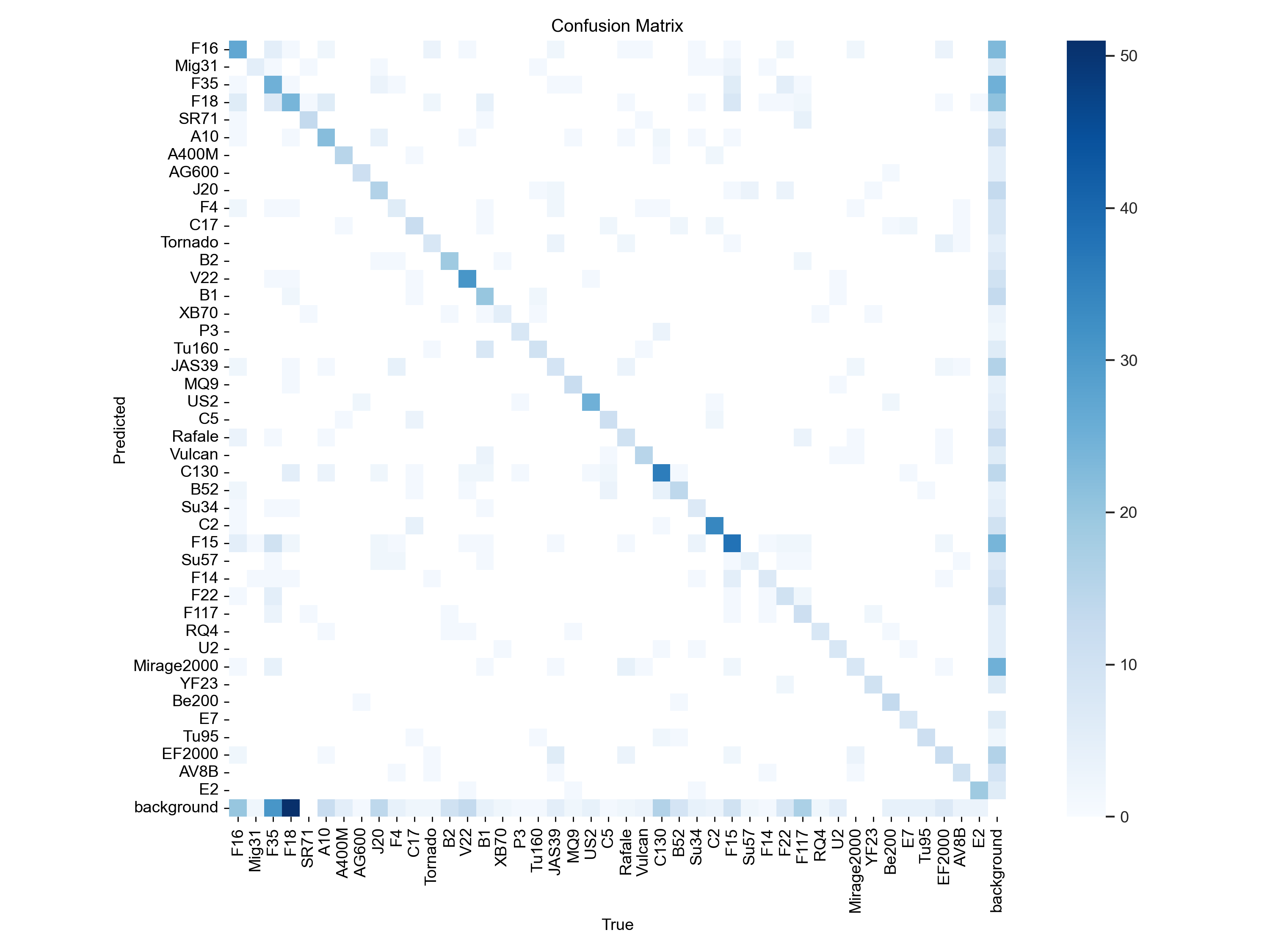 (1)模型整体表现尚可;部分特定型号(如J20、F35、Be200)的检测效果尤为突出。