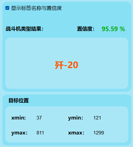 (1)这表明模型对检测到的目标归类为"歼-20"类型的信心程度达到95.59%。