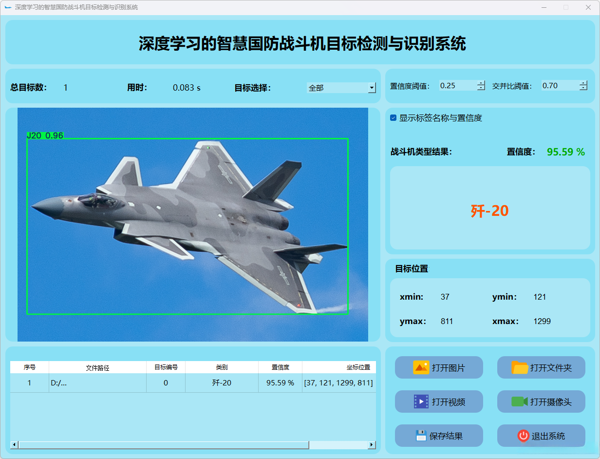 (1)当前选中的结果为 “歼-20″,表示系统正在高亮显示检测到的“J20”。