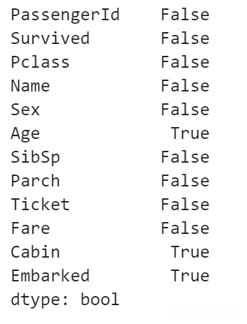 titanic.Age.isnull().any() #查看特定列缺失值/true指有缺失值——故Age列有缺失值