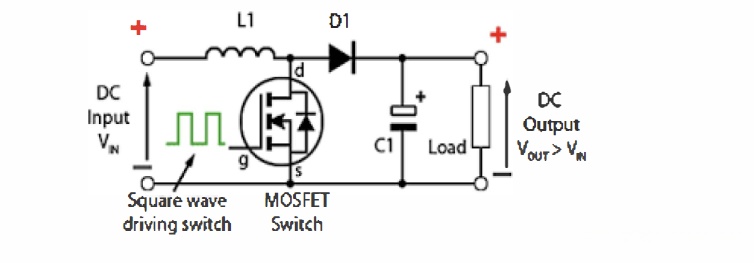 当开关关闭时间为tl时,电感L中的电流增大;若开关打开时间为t2,则储存在电感L中的能量经由二极管D转换至另一边电路。在此过程中,开关的占空比a定义为其开启时间与开关周期长度之比;因此输出电压高于输入电压(如公式所示)。