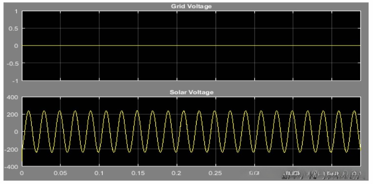 图3描绘了在太阳辐照度达到临界值O时电网与太阳能系统电压波形的变化情况。 根据图3所示,在太阳辐照度为零的情况下,太阳能系统未产生电压。