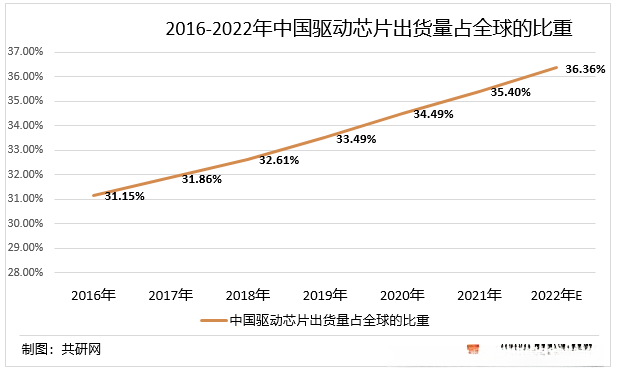 基于中国驱动芯片出货量占全球市场的比例可以看出,在过去六年中(2016至2021年间),中国的这一领域产品在全球市场的占比均维持在30%以上的水平,并且呈现逐年上升趋势。预测表明,在未来的一年里(即到2022年),中国的这一领域产品在全球市场的占比将升至36.36%,较去年增长了约1.04个百分点。