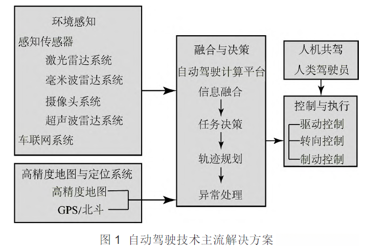 自动驾驶功能的实现,主要是依赖于环境感知传感器、自动驾驶计算平台、网联通信设施以及人机交互系统等,其主流技术解决方案如图1 所示。对于自动驾驶汽车来说,环境感知系统相当于其五官,自动驾驶计算平台则相当于其大脑,为了实现V2X 功能则需要网联通信设施,人机交互系统则是自动驾驶汽车的另一个重要的板块。