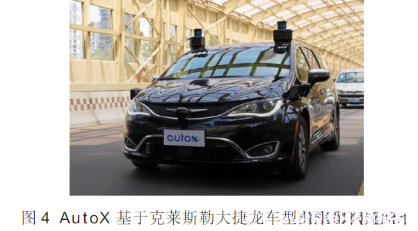 2020 年,AutoX 获上海新规2.0 后的首批牌照,并开启第三代的RoboTaxi 在沪对外公开载人示范应用,标志了上海首批自动驾驶出行对外开放运营,覆盖嘉定区主要城市路段。2022 年9 月1日,上海自动驾驶出行对外开放运营新增投入服务车型为搭载AutoX Gen5 的AutoX 第五代RoboTaxi—克莱斯勒FCA 大捷龙,如图4所示。该车搭载有其自研的核心计算平台AutoX XCU和自动驾驶域电子电气架构,算力达2200 TOPS,实现了车规级别功能安全的全栈架构冗余。该车还具备由国际车企巨头克莱斯勒FCA 深度合作打造的车规级冗余线控,也是中国首个可量产真正无人驾驶的车型。