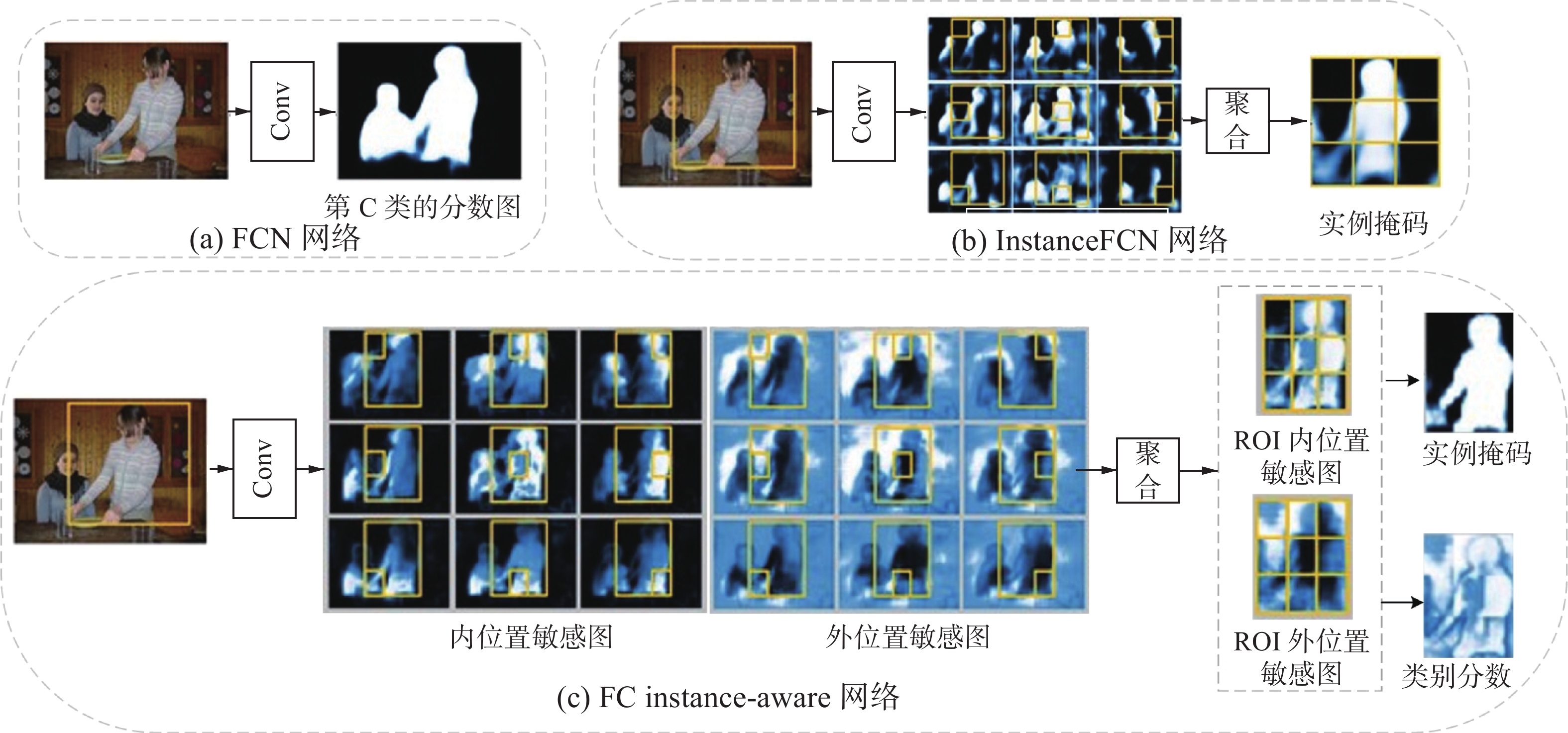 图5(a)展示的FCN架构简洁明了,其高效性能在语义分割任务中得到了广泛应用。Instance FCN[35]首次将FCN网络应用于实例分割任务,通过将实例特征嵌入到位置敏感图中,实现了目标实例的平移不变性。具体而言,该方法将FCN的输出通道数扩展为多个,每个通道专门捕获不同实例的位置信息,通过融合位置敏感图生成每个实例对应的掩膜。