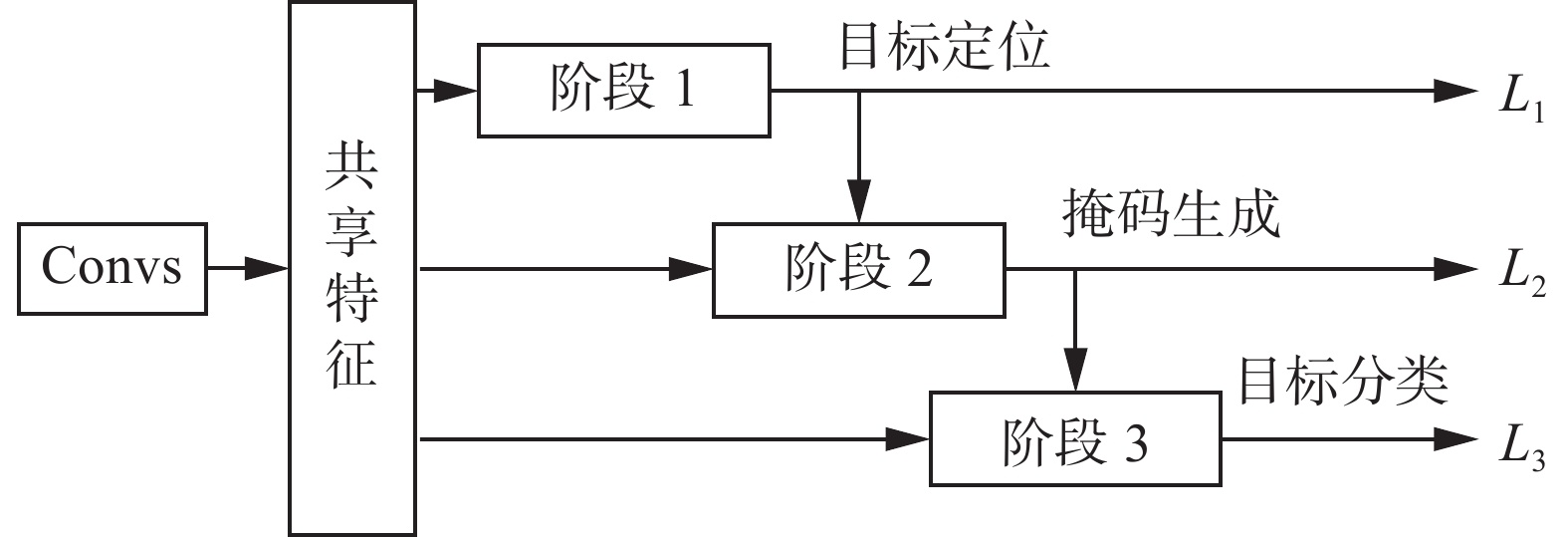 但是,前述方法在生成候选掩膜区域时,未能充分利用深度学习特征和大规模训练数据的优势,导致推断速度较慢。这些因素都是影响实例分割性能的关键瓶颈。2016年,何凯明团队在多任务网络级联(MNC)[12]中,提出了一个级联架构,如图3所示,将实例分割任务划分为目标定位、掩码生成和目标分类三个子任务。这些子任务共用一个主干网络结构,并通过级联的方式进行处理,即每个子任务的输出依次作为下一个子任务的输入。这种设计使得主干网络能够共享三个子任务的监督信号,从而更有效地学习到有用的特征。此外,该架构的一个显著优点是能够快速实现推断过程。
