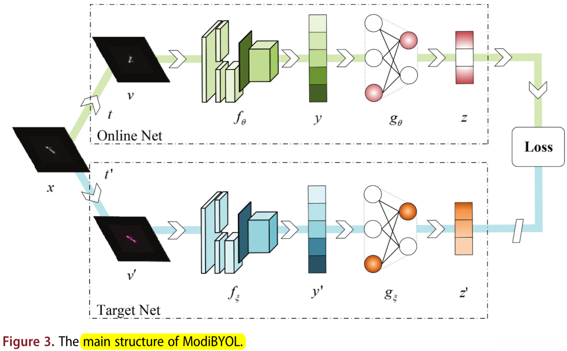 图3给出了ModiBYOL方法的计算图。如图3所示,ModiBYOL方法的主要思想 是通过一个 在线网 和 一个目标网 来学习进一步下游任务的表示。在线网络 和 目标网络具有相同的网络结构 ,但在权值(θ)更新上采用不同的策略:带对比损失的反向传播 和 基于参数的加权动量回归。