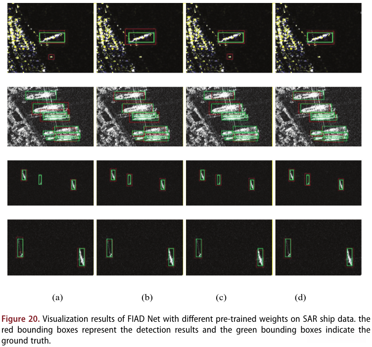 从图 20 可以看出,在四种方法的第一行中,使用 ModiBYOL 训练的 FIAD Net 的结果检测到具有最准确边界框的船舶 ,而从头开始训练的结果和 OriBYOL 错误将礁石检测为船。第二行,a) 所有结果都将中部的三艘船绑定为一艘,底部的两艘大船也绑定为一艘。 b) 使用 VOC2007 预训练权重和 ModiBYOL 权重训练的 FIAD Net 的结果 比从头训练的 FIAD Net 和 OriBYOL 权重更准确。在第三行,从零开始训练的 FIAD Net 只检测到两个目标。第四排,从零开始训练的FIAD Net反复检测到左边的船;使用 VOC2007 预训练权重训练的 FIAD Net 在左下方检测到船舶。总体而言,使用 ModiBYOL 训练的 FIAD 网络在这些场景中表现最好,准确度更高 。