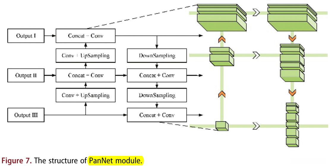 在SPP结构之后,本文采用 PAN 来进一步 增强信息融合 和 对多尺度特征的敏感性 。如图7所示,与特征金字塔网络不同,PAN 向上采样高级特征图,并将信息聚合到低级特征图中。