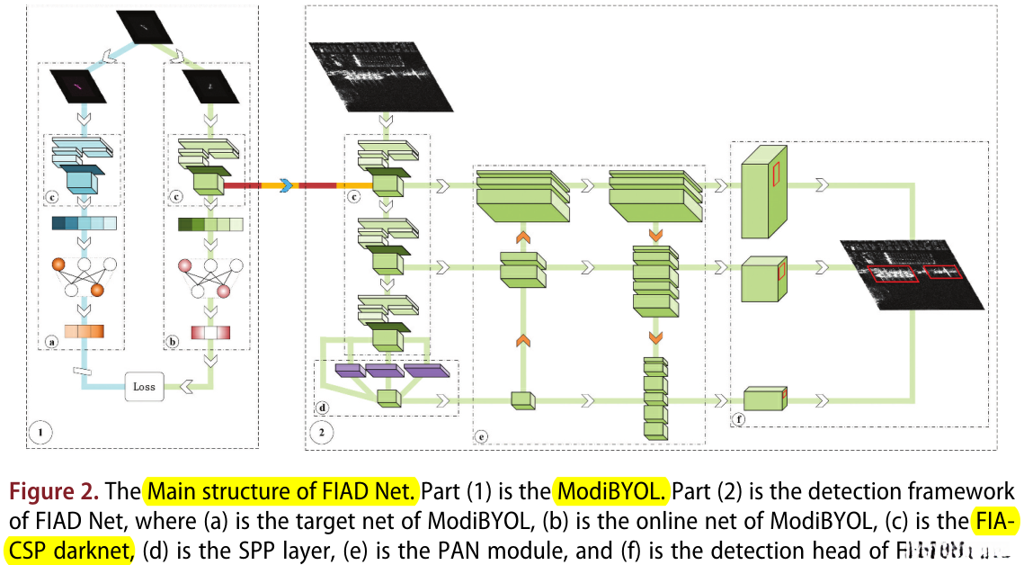 基于以上分析,在本节中,将详细介绍所提出的方法。首先,介绍了FIAD net 的主要结构。其次,提出了 SAR数据 定制的自监督学习方法 ModiBYOL 。第三,介绍了 嵌入了FIA模块的主干网络。第四,介绍了FIAD网络的 neck 模块。第五,带来了FIAD网的 检测头。第六,推导了计算 训练损失 的公式。