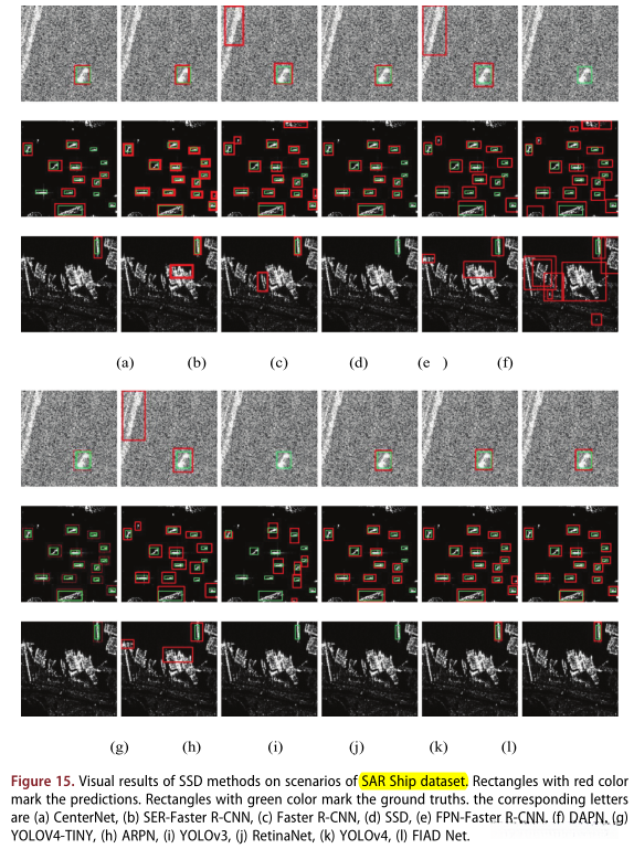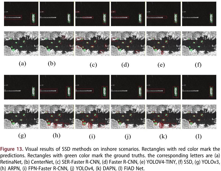 在图15的第一种场景中,船舶的显著性受到图像噪声的严重干扰 ,(c) Faster R-CNN、(d) SSD、(e) FPN-Faster R-CNN和(h) ARPN的检测结果 错误地将左上角的陆地检测为船舶。此外,(f) DAPN和(i) YOLOv3 未能在该图像中检测到任何船只。然而,(a) CenterNet, (b) SER- Faster R-CNN, (g) YOLOv4 - tiny, (j) RetinaNet, (k) YOLOv4,和(l) FIAD Net已经正确检测。