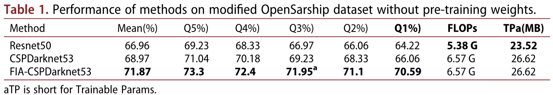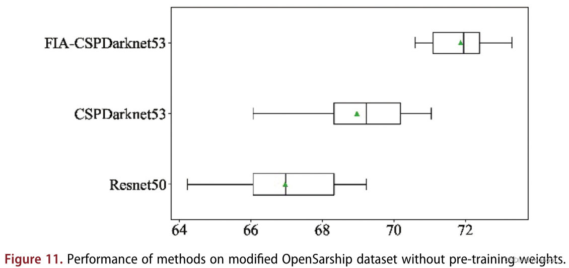 a)FIA模块的有效性 :我们在图11和表1中展示了 没有预训练权重的 骨干网性能。可以看出,以CSPDarknet53为骨干的FIA层在所有四分位上都优于原有的CSPDarknet53和Resnet50。例如,提议的FIA-CSPDarknet53比CSPDarknet53和Resnet50平均高出2.9%和4.91%。从表1可以看出,比较CSPDarknet53和FIA-CSPDarknet53的计算复杂度,FLOPs和Trainable Parameters是相等的。另外,从图11可以看出,从精度分布范围比较,FIA-CSPDarknet53更加集中。