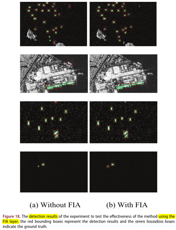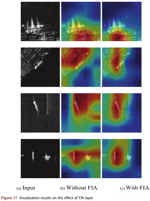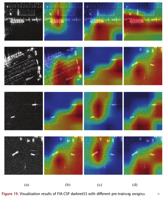 此外,图17中展示了CSPDarknet53网络的最后一个卷积层和从头训练的FIA-CSPDarknet53的 激活映射图。与没有FIA层的第二列相比,第三列的激活权重更加集中。此外,第三列中 激活权重的位置 比没有FIA层的位置更准确 。近岸场景 的激活图 不如 远岸场景的精确。近岸设施可能是分散网络的影响因素 。