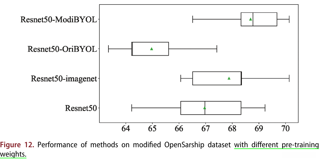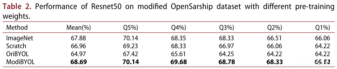 b)改进的BYOL方法有效性 :本文在Resnet50上进行了相同设置的实验,结果如图12和表2所示。从图12可以看出,用ModiBYOL和Imagenet权值训练的Resnet50的Q5和Q1 很接近。在四组实验中,原始BYOL预训练权重的性能最不理想。这可能是由于在SAR图像中的船舶是相对较小的物体,具有不同的方向 。