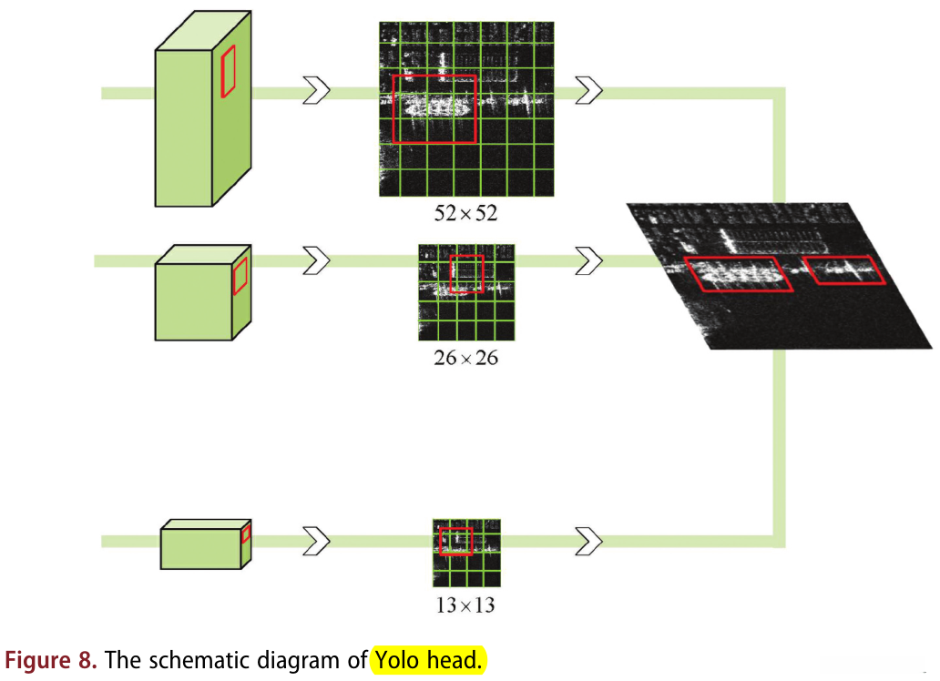 为了检测多尺度船舶,本文采用 YOLOv3 的头部结构 从颈部 提取 位置 和 类别信息。如图8所示,我们处理了三层特征,将 检测头 和 颈部 的输入 与 主干的中间层、下层和底层连接起来。当使用(416、416、3)的输入进行检测时,三个链路的输入形状为(52、52、256)、(26、26、512)和(13、13、1024)。这些最后预测一个 用边界框、置信度和类别 编码的三维张量。我们在每个尺度上预测三个边界框,因此张量为