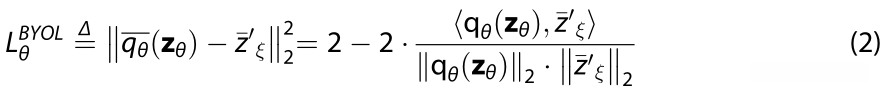 如式(1)所示,首先,给定图像x;我们用不同的增强方法 t 和 t’ 生成了两个图像(v和v’ ),我们有v=t(x) 和v' = t' (x) 。其次,在在线网中,我们使用在线网络 fθ 来学习特征表示,然后我们有y=fθ(v)。之后,我们使用 多个全连接层 来 重新投影编码的特征z=gθ(y)。