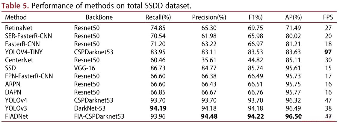 c)用 整个SSDD数据集 检测结果。表5显示了方法在整个SSDD数据集上的性能。从表5可以看出,FIAD Net在Precision、F1、AP三项得分最高,在Recall三项得分第二高。这意味着 FIAD Net 的综合性能可以与最先进的技术相媲美 。