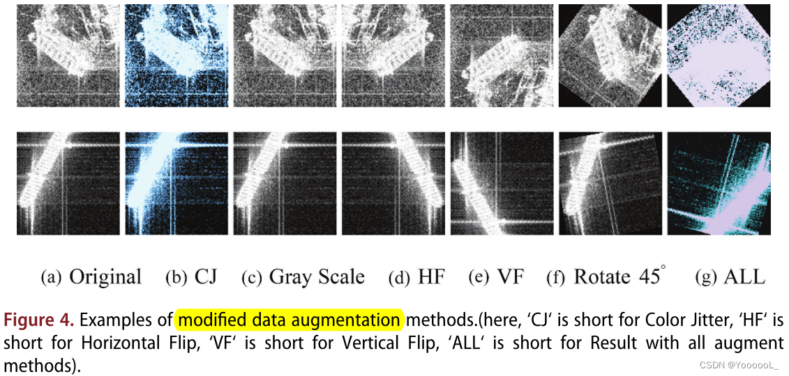 由于SSD任务中的 舰船通常是作为一个完整的目标 来检测的,并且 舰船具有 旋转不变性,这些先验知识与一般的目标检测有很大的不同。因此,本文 修改了SSD预训练中 的数据增强策略 。不同于工作(Grill等人2020;陈等2020b)中使用的增强方法。本文 利用 颜色抖动、水平翻转、垂直翻转、随机旋转 和 随机灰度 对SAR船进行预训练 。转换后的结果可以在图4中看到。