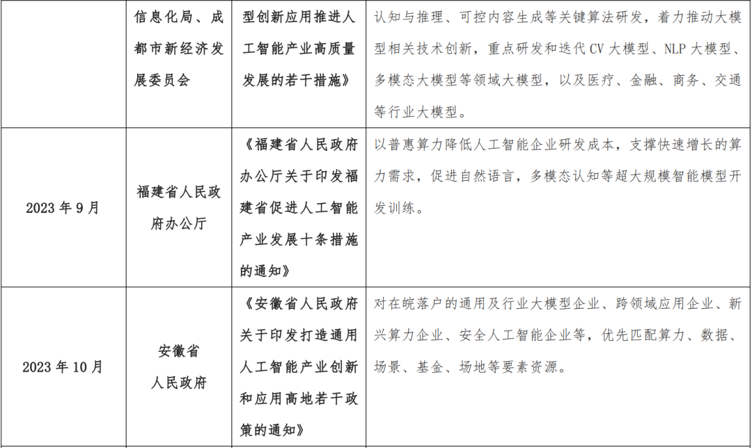 当前,北京、深圳、杭州、成都、福建、安徽、上海、广东等地均发布了关于 AI 大模型的相关政策。具体来看: