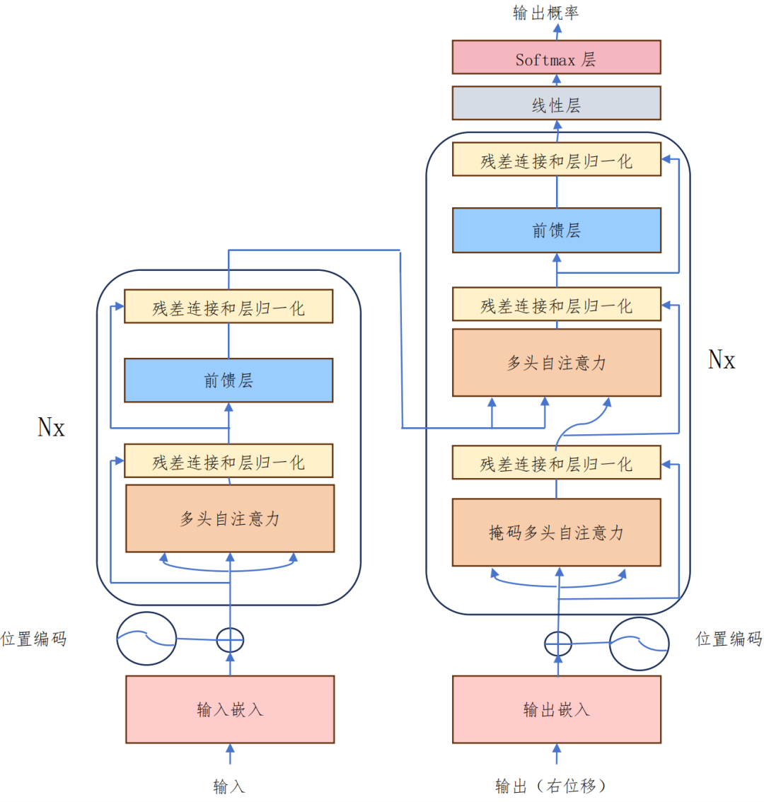 Transformer 架构主要由输入部分、多层编码器、多层解码器以及输出部分组成。其中,输入部分包括源文本嵌入层、位置编码器;编码器部分由 N 个编码器层堆叠而成;解码器部分由 N 个解码器层堆叠而成;输出部分包括线性层和Softmax 层。