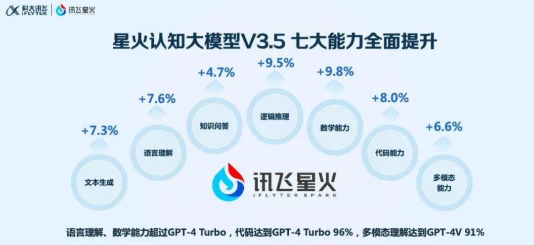 讯飞星火七大能力的提升,实现了各类应用场景性能升级。