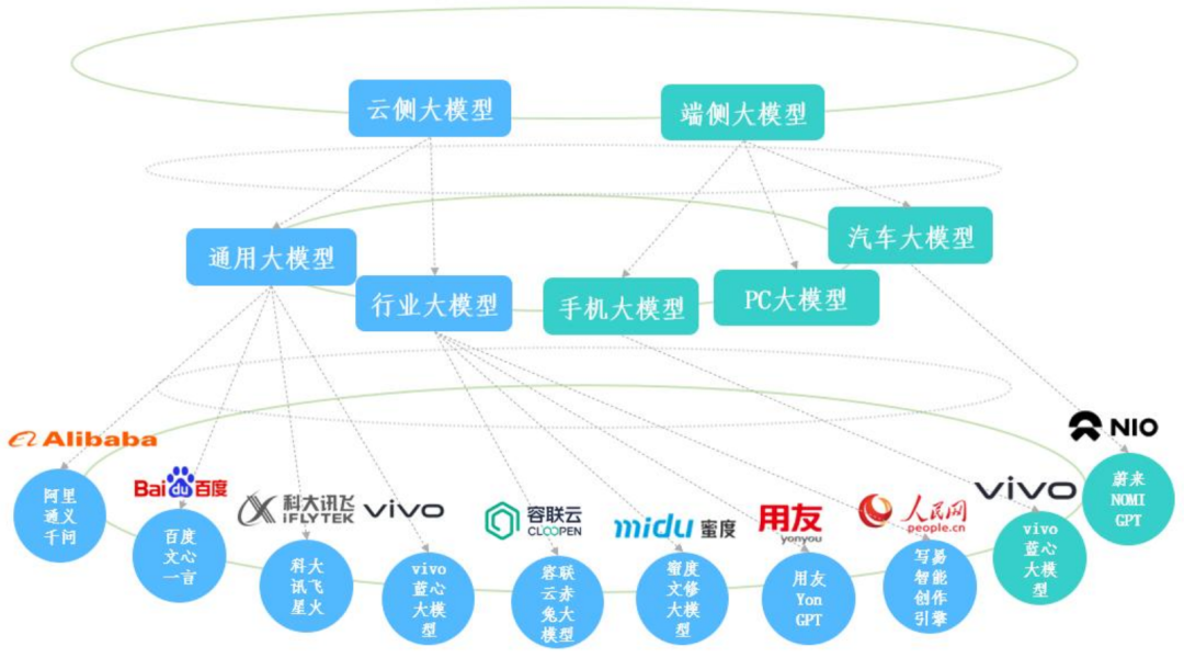 我国具有代表性的通用 AI 大模型主要包含科大讯飞的讯飞星火认知大模型、百度公司的文心一言大模型、阿里巴巴的通义千问大模型等;行业AI 大模型主要涵盖蜜度的文修大模型、容联云的赤兔大模型、用友的 YonGPT 大模型;同时具有云侧和端侧大模型的端云结合 AI 大模型主要有 vivo 的蓝心大模型;端侧 AI 大模型主要以蔚来的 NOMI GPT 大模型为代表。