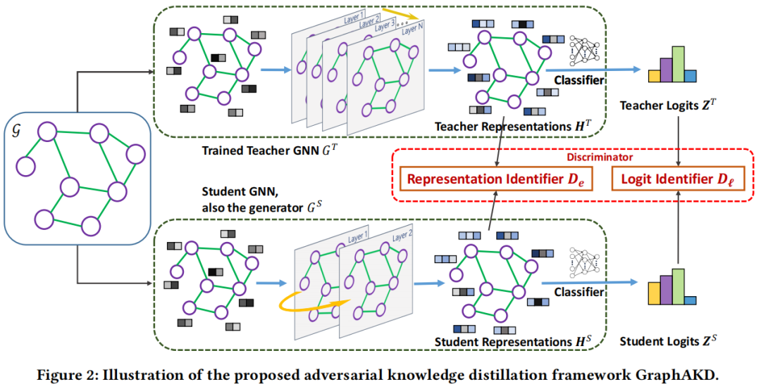 中国科学技术大学人工智能研究所王杰教授团队发表在KDD 2022上关于图神经网络的文章:《Compressing Deep Graph Neural Networks via Adversarial Knowledge Distillation》。深度图神经网络(GNN)已被证明在建模复杂图结构数据方面具有很强的表现力。然而,这种过度堆叠的架构使其难以在移动或嵌入式系统上进行部署和快速测试 。为了压缩 over-stacked GNN,通过师生架构进行知识蒸馏被证明是一种有效的技术, 其关键步骤是使用预定义或固定的的距离函数来衡量教师和学生GNN之间的差异,但在结构、大小不同的网络数据中,这种距离(如KL散度、欧氏距离)不能很好地衡量教师和学生GNN学习的差异。因此,作者提出了一种新型的对抗性知识蒸馏框架GraphAKD,通过对抗性训练判别器和生成器来自适应地检测和减少差异 。在节点级和图级 分类基准数据集上的实验表明,GraphAKD可以将知识从复杂的教师GNN转移到紧凑的学生GNN,显著提高了学生GNN的表现。