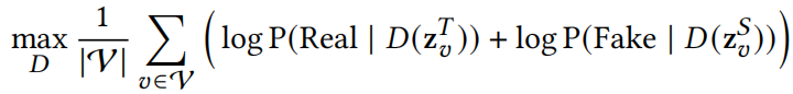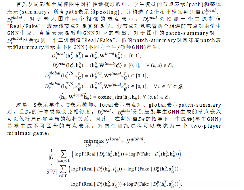 为图级表示(summary)和节点级表示(patch)之间互信息的最大化。Max: 让判别器能够最大化地判别出生成器的节点表示是来自于教师GNN还是学生GNN;Min: 要求生成器能够最小化教师表示与生成表示(学生)的差异。