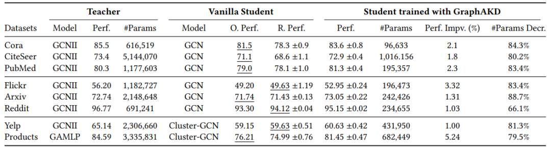实验环节中,作者选取GCNII作为教师网络模型,简单的GCN、GIN作为学生网络模型,在3个公开图数据集上与多种先进知识蒸馏方法进行了对比,结果验证了GraphAKD 的先进性能,且通过这种方式训练的学生GNN获得了比教师图模型更有竞争力甚至更好的结果,而具有更少比例的参数和更少的时耗。