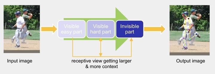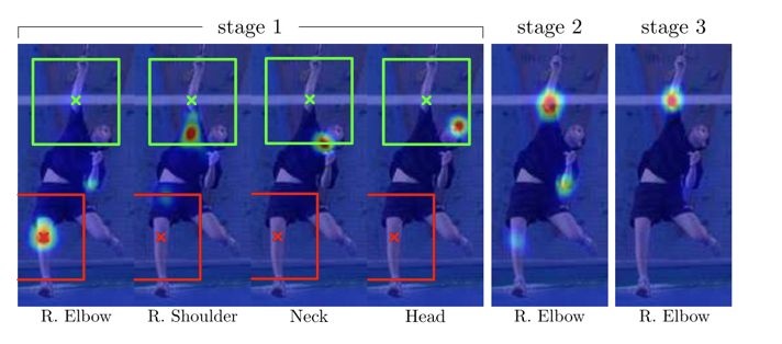 通过建立各部件响应图来描述各部件间的空间约束关系,并将其与特征图结合使用以实现数据在网络中的传播过程。人体关键点的空间先验分布有助于指导网络的学习过程。假设在stage 1的预测结果中右肩关键点被正确识别而右肘关键点未能被正确识别,则后续stage的空间先验分布将进一步指导网络的学习行为。如下图(源自论文[12]中的内容)所示。