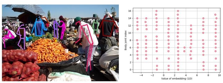 Associative Embedding:基于高维向量的空间编码技术被用来表示人体的关键点之间的关联关系;具体而言,在同一人体内各个关键点会被映射到高维空间中以实现相互靠近的目标;而对于来自不同人体的关键点则会被尽量分离;最终系统会根据两个关键点间的距离计算结果来确定它们是否属于同一人体从而实现聚类功能