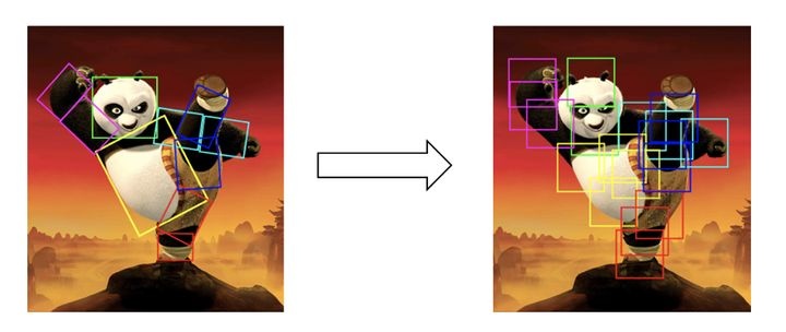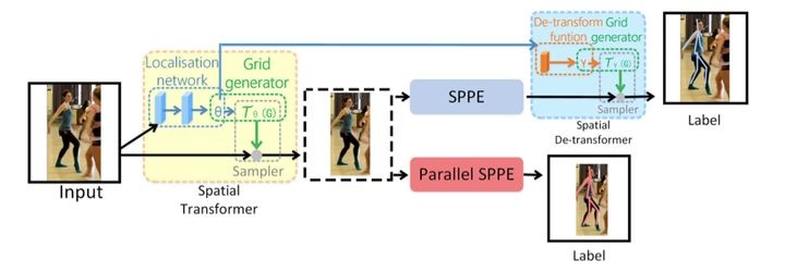 本论文重点探讨了基于从上至下关键点检测算法的目标检测流程中Proposals生成环节存在的问题。研究发现,在这一过程中可能存在的主要问题是:首先存在由于定位误差导致裁剪区域未能充分包含人体整体的比例问题;其次对于同一物体可能出现多次Proposals的情况,在不同区域裁剪可能导致关键点定位结果不一致的问题。针对上述问题提出了一种新型算法:通过空间变换网络将同一人体不同裁剪区域(即不同Proposals)映射到一个较为优化的结果中(即对人体而言应在正中央位置进行裁剪),从而避免因多重Proposals导致的关键点检测效果不一的问题。具体实现流程如图所示(摘自论文[14])。