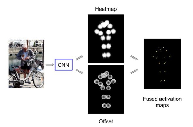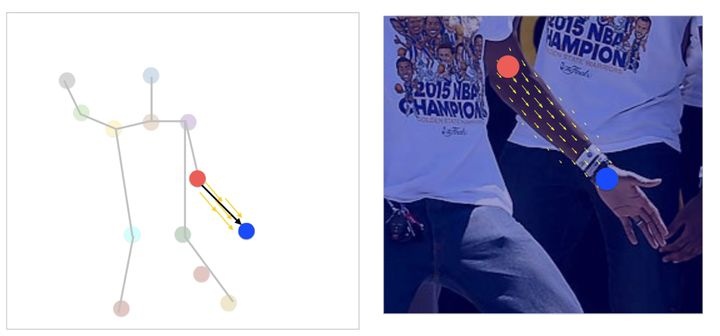 最后,在构建Ground Truth时主要采用的是Google于CVPR 2017上提出的方法。相比单纯采用Heatmap的情况而言,在这种方法中Google所提出的Heatmap定义为在目标关键点周围一定范围内的所有像素的概率值均为1;而在此基础上还引入了一种偏移量的概念Offsets(偏移量),这种设计不仅能够反映出对应像素位置相对于目标关键点的空间分布情况;同时还能反映出对应像素位置相对于目标关键点的方向信息。个人认为这种方法相较于单纯的Heatmap构建思路具有显著优势;具体而言不仅能够建立各关键点之间的相对位置关系;而且还能体现出各关键点间的相对方向信息;因此整体效果更为理想。如图所示(摘自论文[9])。