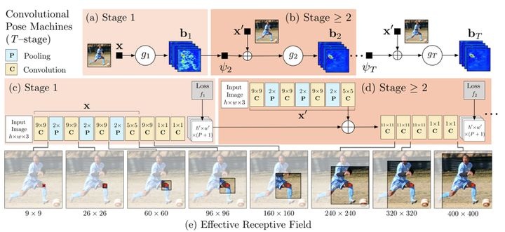 ConvolutionalPoseMachines:本文将深度学习技术应用于人体姿态分析领域,并通过卷积层实现纹理信息与空间信息的表现。主要网络架构划分为多个阶段,其中第一个阶段能够实现关键点初步检测的效果,随后几个阶段则以上一阶段的预测结果以及从原始图像中提取出的特征作为输入,从而进一步提高关键点检测的效果。具体的流程图见下文(参考文献[12])。