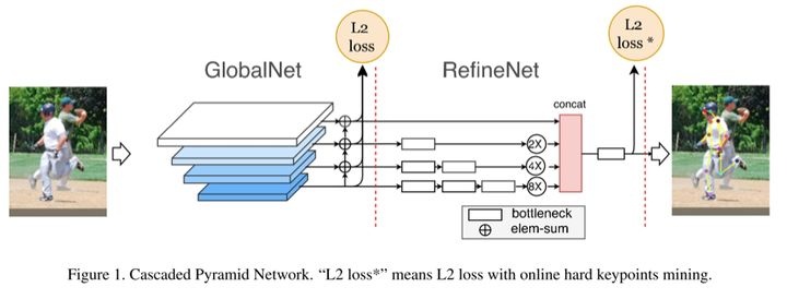 Cascaded Pyramid Network:本论文重点探讨了各类别关键点在不同复杂程度上的检测差异性问题。研究架构的整体思路为:首先通过精确识别较为容易定位的关键点作为基础特征;接着在此基础上逐步推进对复杂度更高的关键点进行定位;最终实现对难以观察或高度隐蔽的关键点的有效识别。具体实现流程如附图所示(参考文献[13]所附幻灯片内容)。