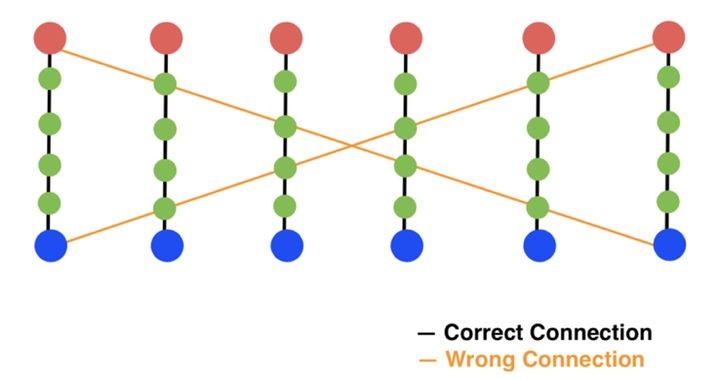 如图所示(摘自论文[16]对应的幻灯片),若仅在中间点与肢体骨骼之间建立对应关系,则当这些关键点位于相应的肢体骨骼上时(即处于同一肢体骨骼的不同端部),将导致图中所展示的错误连接现象。然而,在实际应用中采用的PAFs方法不仅建立中间点与肢体骨骼之间的对应关系(即第17页),而且在这些关键点的中段位置附加了方向信息(即第18页)。这种改进使得该方法能够有效避免上述错误连接现象的发生。