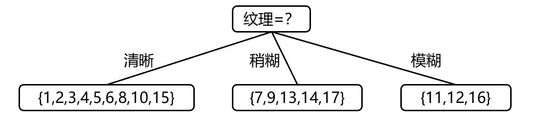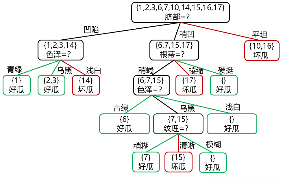 对每个分支结点根据信息增益准则做进一步划分,得到决策树: