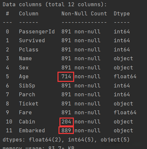 1、Age、Embarked和 Cabin 这三个字段的数据有所缺失。