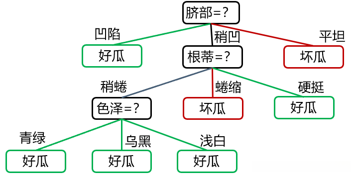 预测过程:将测试示例从根结点开始,沿着划分属性所构成的“判定测试序列”下行,直到叶结点。