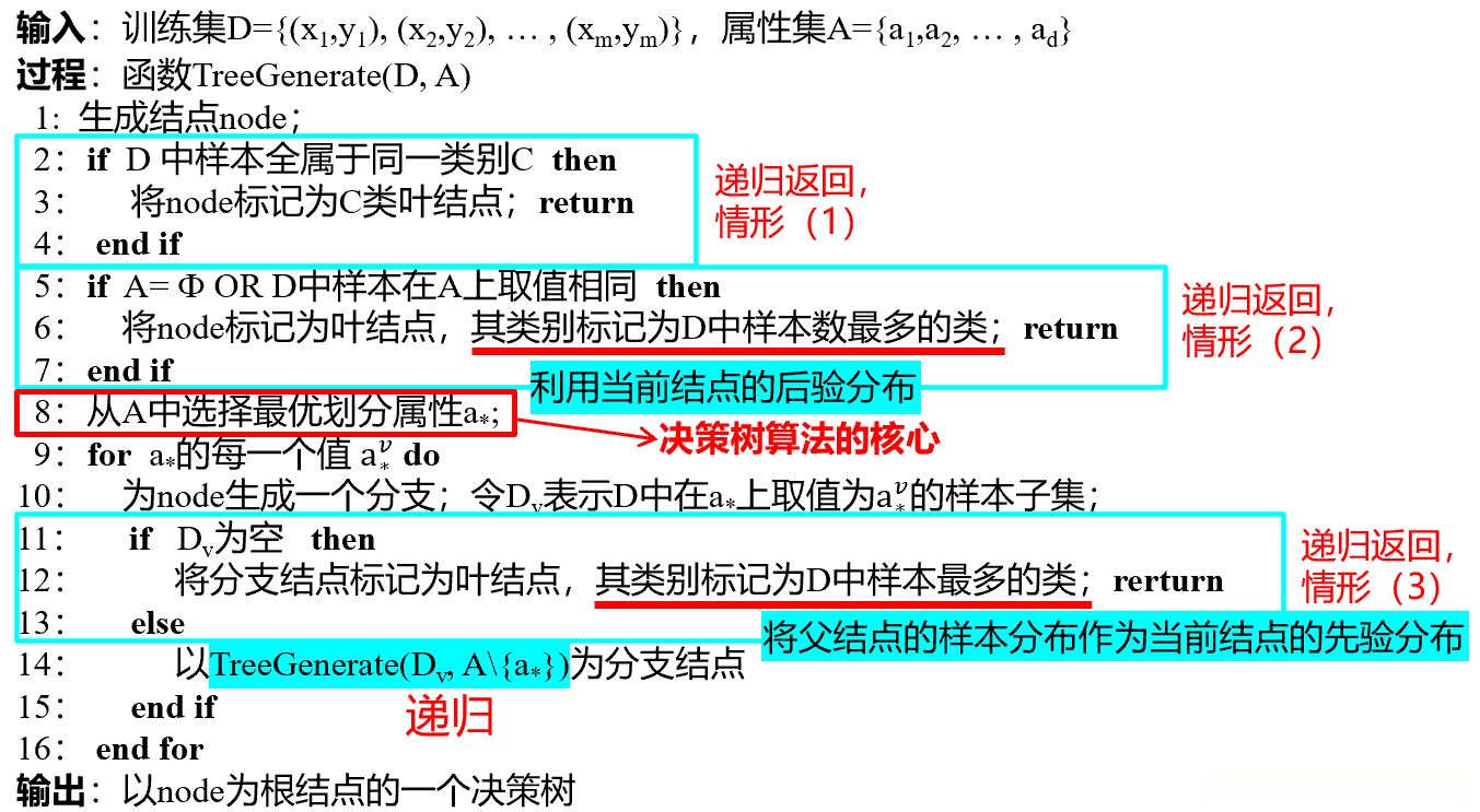 学习过程:通过对训练样本的分析来确定“划分属性”(即内部结点所对应的属性)。