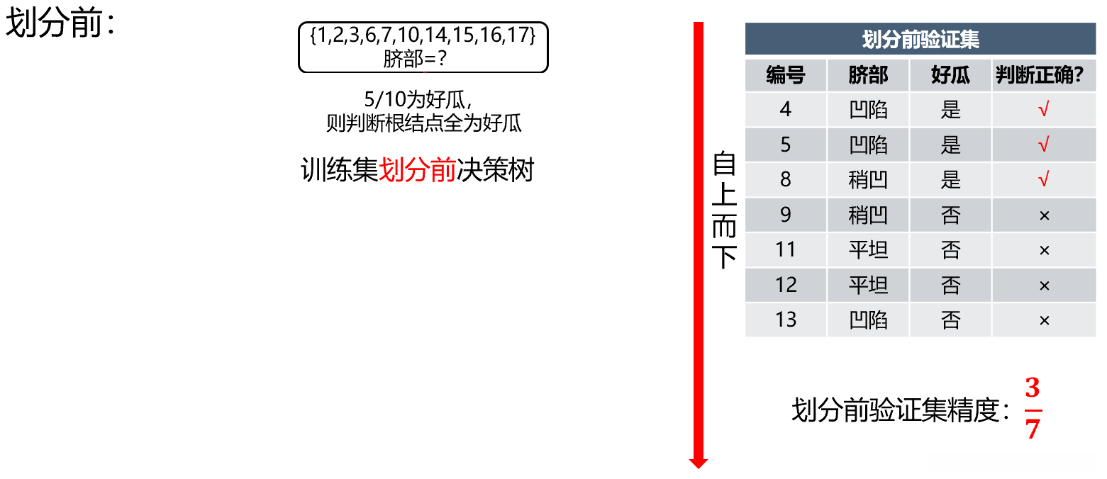 划分前验证集精度:3/7 > 划分后验证集精度:5/7
