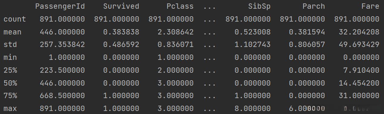 2、了解数据表的统计情况:总数、平均值、标准差、最小值、最大值等。