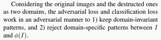 2)在3.1.2节中,作者说分类loss和对抗loss是以对抗的形式进行工作。分类loss是不区分原图和破坏图的,对抗loss区分原图和对抗图,这样才是对抗的。