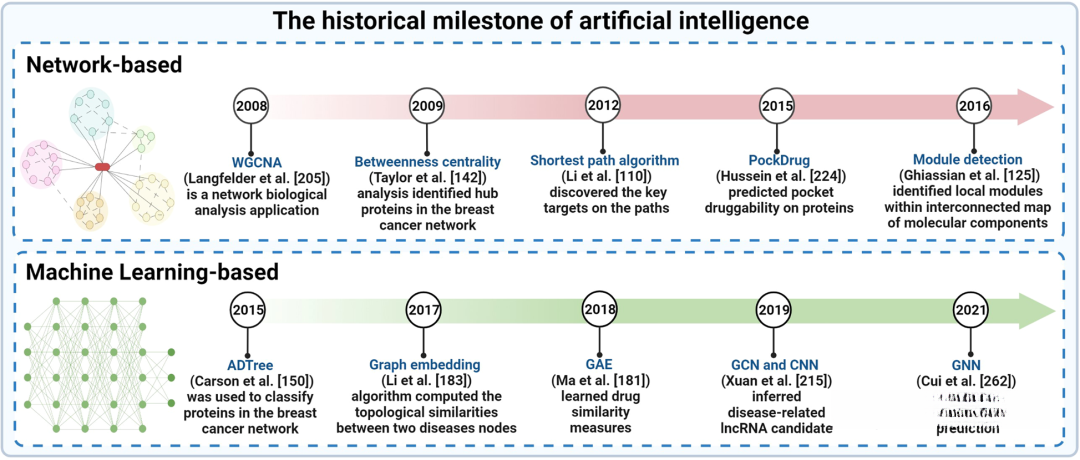 为了使这项研究易于理解,我们不仅根据生物网络结构的数据将这些人工智能算法分为基于网络的生物学分析算法和基于机器学习(基于ML)的生物学分析算法,而且还采用了下图来描述这些人工智能生物学分析算法的历史里程碑。