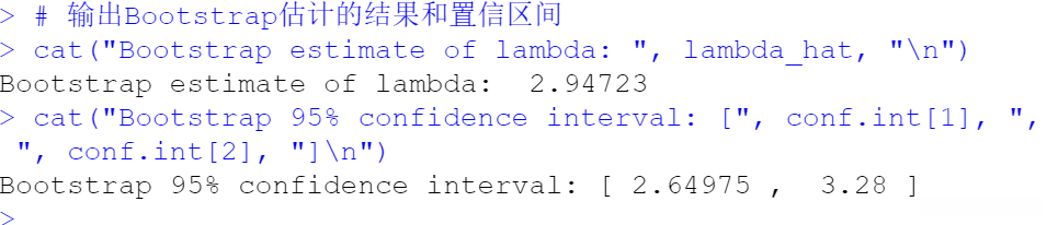 在代码中首先生成了一个服从泊松分布的随机样本随后定义了一个用于Bootstrap估计的关键统计量即该样本均值通过boot函数执行Bootstrap估计其中R参数指定了重复采样的次数我们计算了Bootstrap样本均值并利用quantile函数确定百分位数 Bootstrap估计对应的置信区间最后输出了\lambda估计值及其置信区间