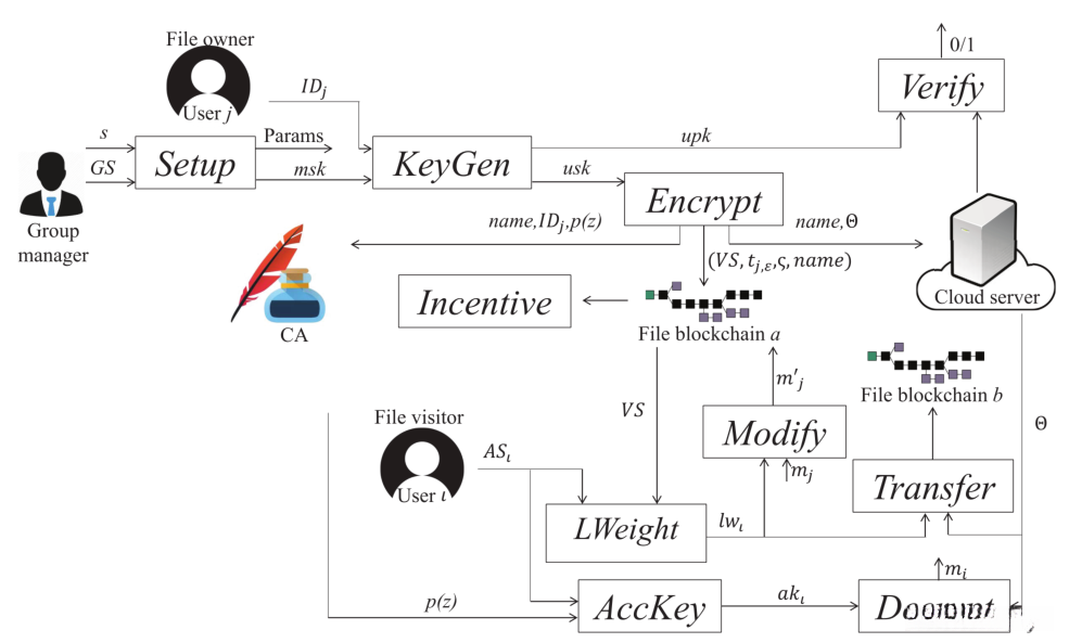 - 上传数据:用户将数据加密至云端,访问策略计算为一个多项式发送给CA,将访问控制策略中各个属性要求的值和访问需要达到的阈值发送到区块链,区块链会返回给用户奖励