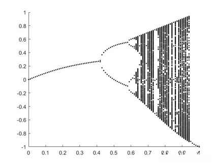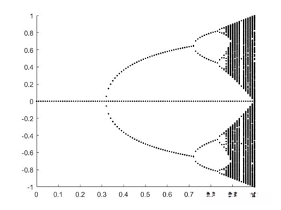 纵轴为迭代值,从仿真图可以看出,在0.4附近呈现第一次分岔,在0.6附近呈现第二次分岔,在0.65附近呈现第三次分岔,之后,系统进入混沌状态。